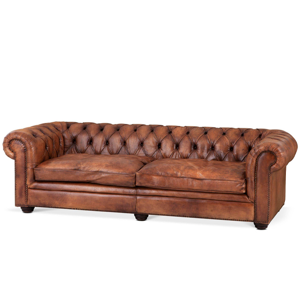 Диван в стиле честерфилд в обивке из состаренной кожи табачного цвета, со стяжкой капитоне. С двумя удобными подушками сидения, привлекательными декоративными складками на подлокотниках и округлой спинке, а также декоративными гвоздиками из латуни вокруг подлокотников, на шарообразными коричневых деревянных ногах.