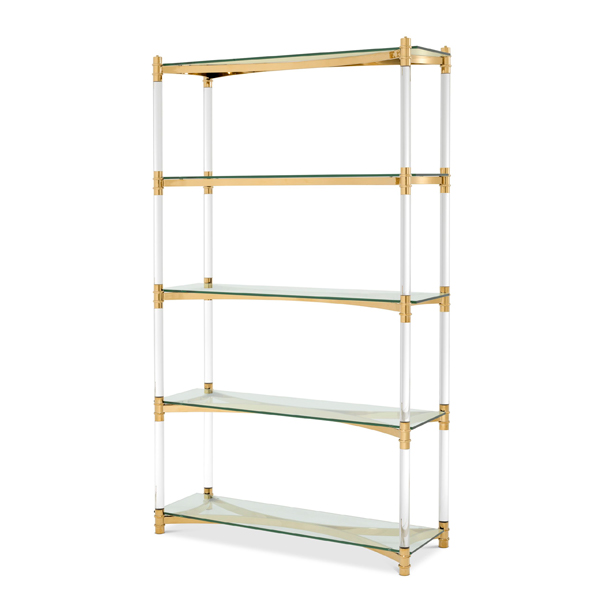 Современная этажерка в матовой металической золотой отделке с каркасом из прозрачных акриловых направляющих, 5 полок из прозрачного стекла.